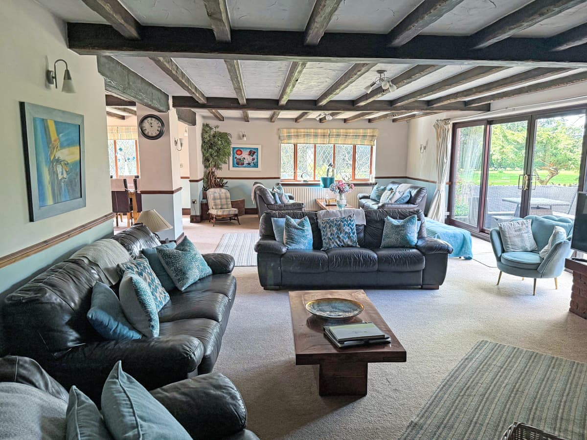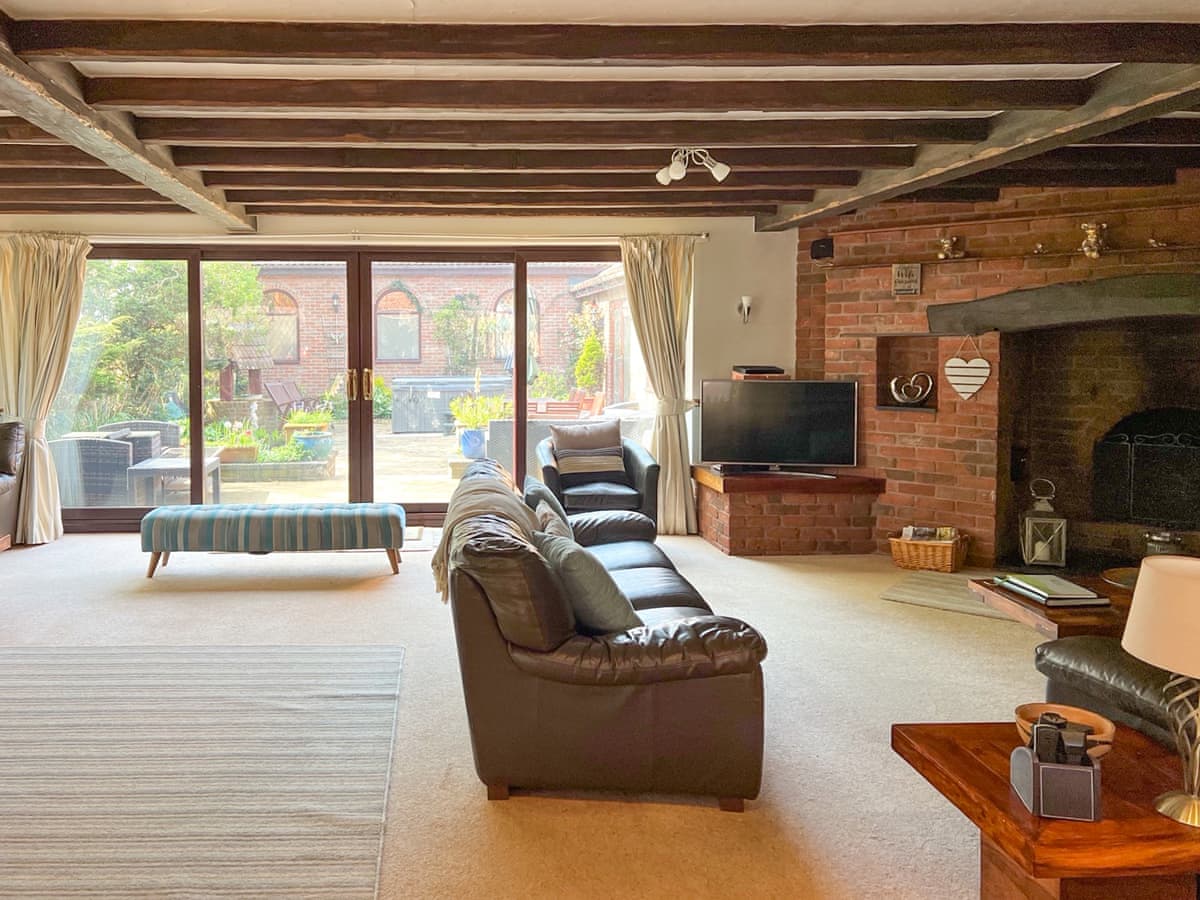 The expansive open plan living area is equipped with plenty of comfortable leather sofas, crafted wooden coffee tables and a huge inglenook fireplace with an open fire.