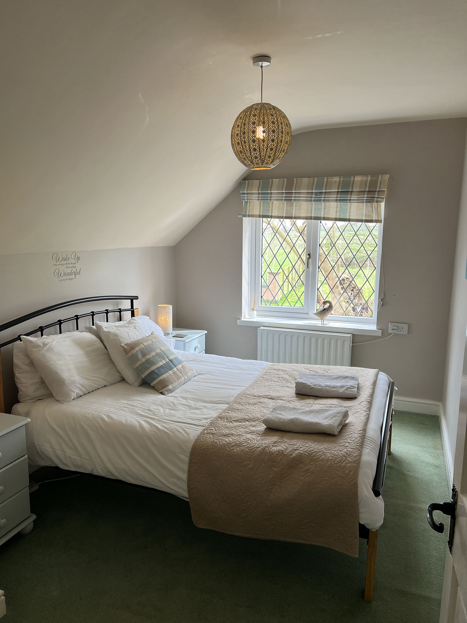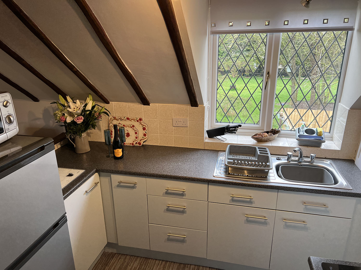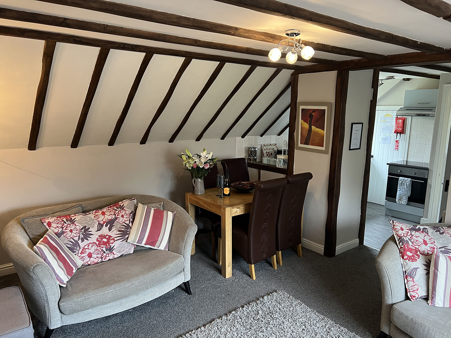 Hayloft is a quirky first floor apartment. The entrance hall leads to an open plan lounge, dining and kitchen area. There is one double room and one twin bedded room. The family bathroom has an over bath shower, toilet and wash basin.